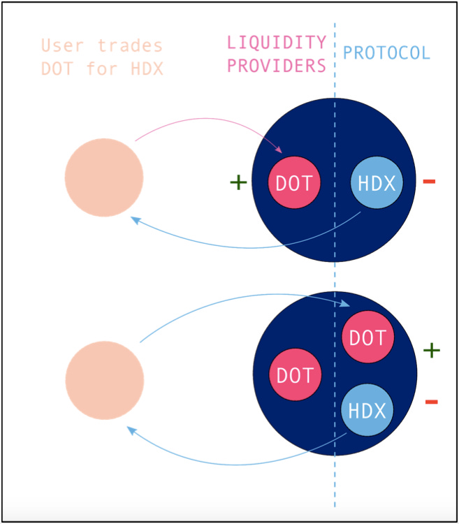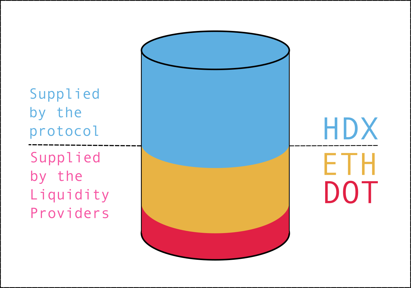 The core idea is to have a base asset ($HDX), which is minted and held by the protocol. This asset will represent 50% of the initial value of the liquidity pool. The other 50% of initial value is provided by the liquidity providers in exogenous assets. The 1:1 ratio is kept algorithmically; as assets are added or withdrawn, native tokens are minted or burned accordingly.