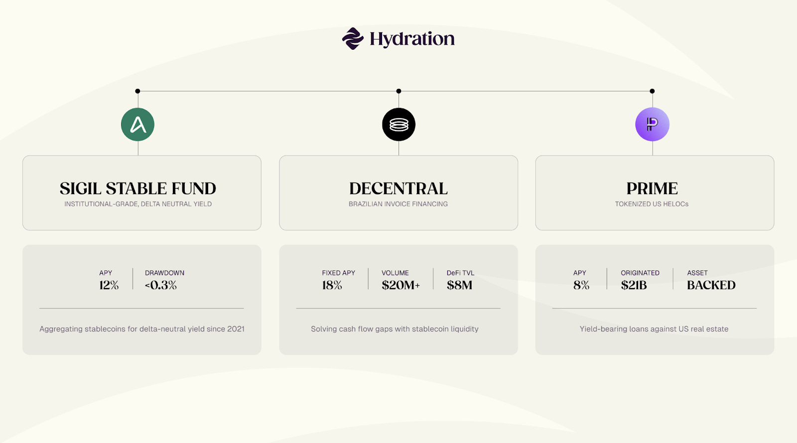 Sigil Stable fund, operated by early Hydration backer Fiskantes, has been running since 2021 with zero drama, no significant drawdowns, and a spotless track record. The fund aggregates stablecoins and provides risk-adjusted yield through delta-neutral strategies.